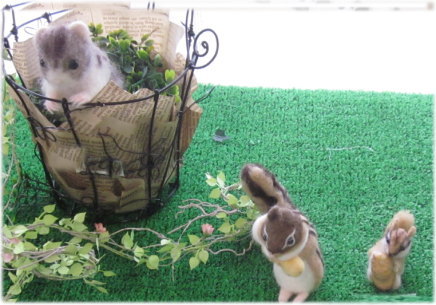 上 ぱんだうさぎさんと。 左上 大きなリスたち相談中 そしてちびっこリスたちは・・・・ 左 たくさん集まって 自由に遊んでますね♪ |