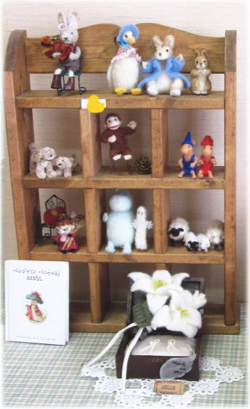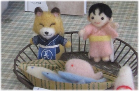 | 右上 手作りの棚にぴったりサイズで作られた、 みんなの大好きな子がいっぱい。 棚の前の百合の花は 娘さんの結婚式用に作られたリングピローです。 右 可愛いきつねさんは、干物やさんのキャラクタ「こんすけ」くん お隣は、乙姫のおとちゃん、 新鮮なお魚付きの展示ですね! |