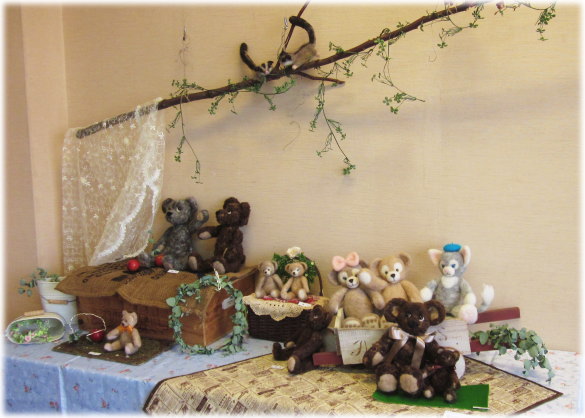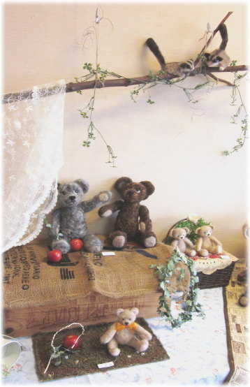 | 可愛いベアたちのコーナー みんな表情豊かで 思わずベアちゃんたちの目線が気になります(^m^) ん? 木の上のフクロももんが見てますか? |