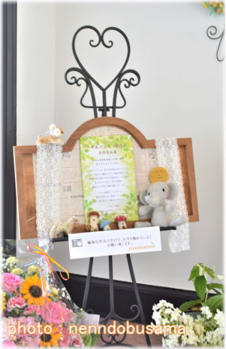 | JEUGIA教室(西友山科1.2・イオン草津1.2・MOMOテラス) & リビング教室 &雑貨屋 アトリエナレットさん教室 合計7クラスの合同展示会を、 私の大好きなびわ湖大津館市民ギャラリーにて 開催しました。 今回の合同作品は ①WELCOMEリース と ②はりねずみの森です。 下 ミモザリースは 皆さんに作ってもらった 小さなミモザを集めて作りました。 101本も集まり、直径50cmもの大きなリースになりました♡ 右 ごあいさつボードです。 右下 こちらも入り口でお出迎えのパンダ親子さん♪ |