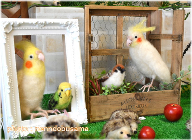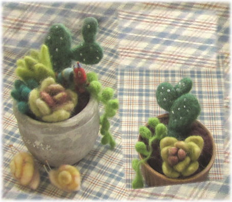 | 上 箱庭の中が、にぎやか(*^^*) わいわいとおしゃべりしてそう! 羊毛とモールとをうまく一緒に飾られました。 右上 にかっと笑う笑顔と とうもころし(トウモロコシ)がチャームポイント♡ 右 多肉植物だって作れます。 良く見たら かたつむりさんや、あおむしさんも居ますよ。 |