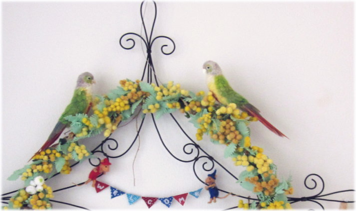 WELCOMEリースには ぐりとぐらが旗を掛けてます(*^^*) てっぺんにはウロコインコが見つめあい (インコちゃんの抜けた尾羽使用) 文鳥に雀、ハムスターにハリネズミ 白テナガザルまで住んでます(笑) ではまず 最初のお部屋から |