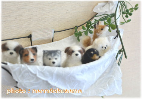 | ちびっこわんこ達は大人気で ずいぶん沢山の方が作られました。 今年は戌年でしたしね^^ リアル系やキャラ系 どの子も本当可愛いです。 左の子たちは もっと小さい 仔犬シリーズ。 |