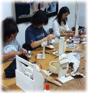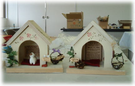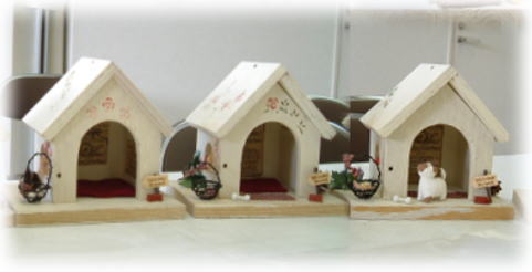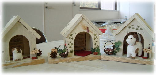 クラフト教室 2006.02 by 瀬田体育館 * かわいい犬小屋を作りましょう * 同じ形の小さな犬小屋を皆さんで組み立てました♪ 今回は手作りの小さなりんご、ボーン(骨)、かご、プレート、ドライフラワーなど 自由にディスプレイをしていただきました。 |