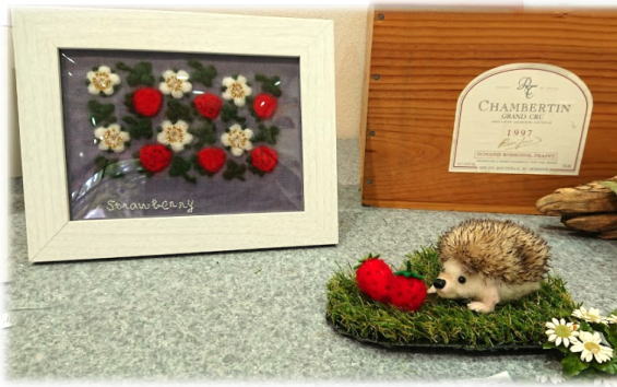左 同じく羊毛刺繍 いちご。 そのイチゴが転がって ハリネズミさんの目の前に! はりちゃんも大喜び? |