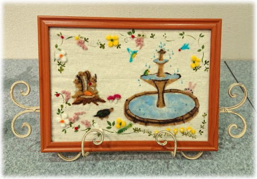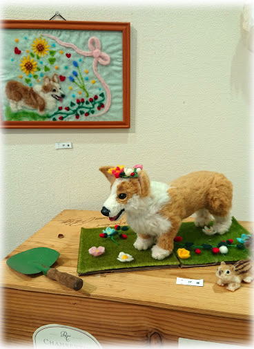 | 右 お花冠のかわいいコーギーさん そして、その子がモチーフになった お花畑のコーギー羊毛刺繍。 毛並みのふわふわを額の中でも表現できてますね! 下 ステンシルと羊毛刺繍の額 野原のオアシスに いろんな生き物が集合して ゆったりとなごんでます(*^^*) |