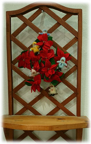| 右 ポインセチアの妖精? ちいさな女子たちが お花のリースの中でかくれんぼしてます。 何人いるでしょうか? |