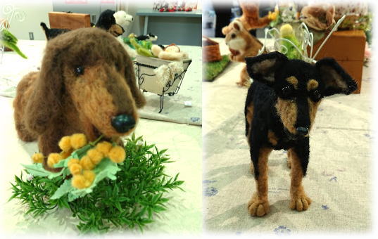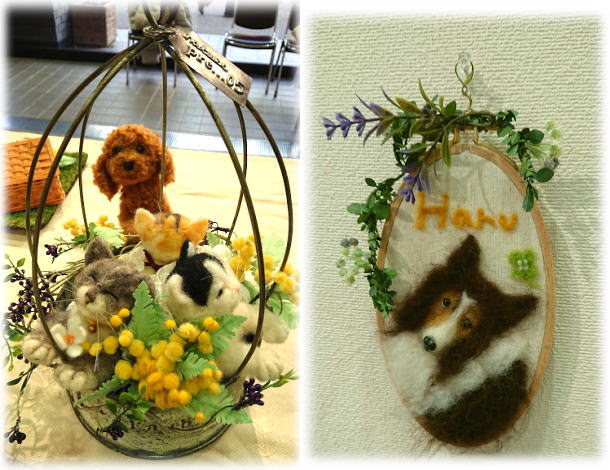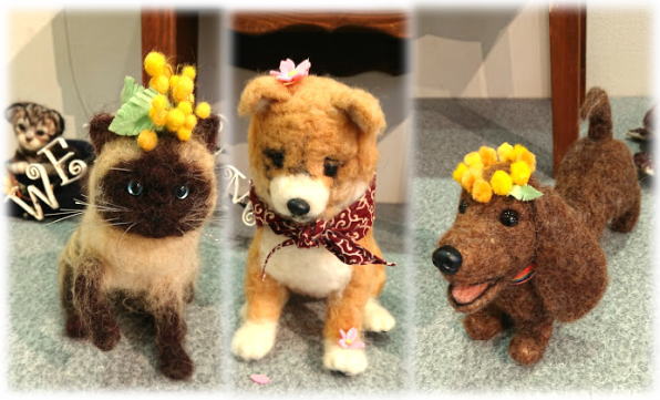 左 にゃんとも言えない表情の ねこちゃん3匹と 遊んでほしそうなトイプーさん。 そして 羊毛刺繍のシェルティーちゃん。 トイプーちゃんは ご実家の子が、 シェルティーちゃんは おうちの子がモデルなんですって♡ |