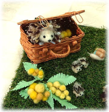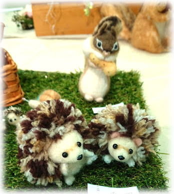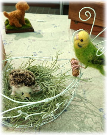 | 右 毛糸のハリネズミさんとミモザ ちびちびはりちゃん。 カタツムリと同じくらいだもん♪ 下&右下 どんぐりゲットで満足気味な?りすさん。 自転車がお気に入りのねこちゃん。 セキセイインコさんに見守られてるハリネズミさん。 手作りのワイヤーとのコラボで、 いろんなお話がうまれますね。 |