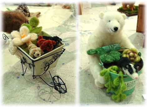 | 上 ご実家のミニュチュアだっくすさんと おうちの子だった、ピンシャーちゃん 特徴を調べて作られました。 右 手作りのワイヤーの一輪車。 小さなわんこがご搭乗。 しろくまさんは 多肉とミニブタのバケツを大切そうに抱えてます♪ |