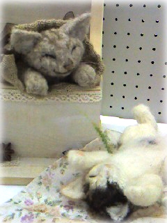 | ほのぼの羊毛 ・・・・というタイトルで 新しく出来たイオンモール草津内 JEUGIAカルチャーにて 羊毛教室を開講することになりました。 そのお陰で羊毛作品が増えました 上のカレンダーのねこちゃんに 一目ぼれしていたので 羊毛で下のねこちゃんを作ってみました♪ じゃれあう猫ちゃんを作ってみました |