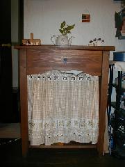 カウンター両面棚 size 33cm×24cm×60cm 実はこの棚、真ん中の仕切りを境に 奥行き10cmくらいの棚がついていて とっても重宝しています。 釘を使わずダボでつなぐのに 大変苦労しました。 |