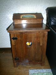 サイドテーブル size 36cm×16cm×11cm size 38cm×40cm×45cm ソファーの高さに合わせて作りました。 上の小物入れは角度をつけるカットが うまく出来ず、初めてカンナを使いました。 ニスが上手く塗れず何度も塗り、結果的に しっかりしたものになりました。 |