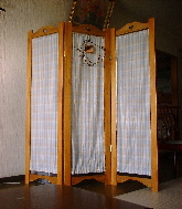 3連スクリーン size 120cm×1.8cm×160cm 枠を作るのに苦労しました。 下の横板は上板をカットした時に 残ったものを、そのまま利用しました。 スクリーンの布は季節によって 替えたいので横棒も外せるように してあります。 |